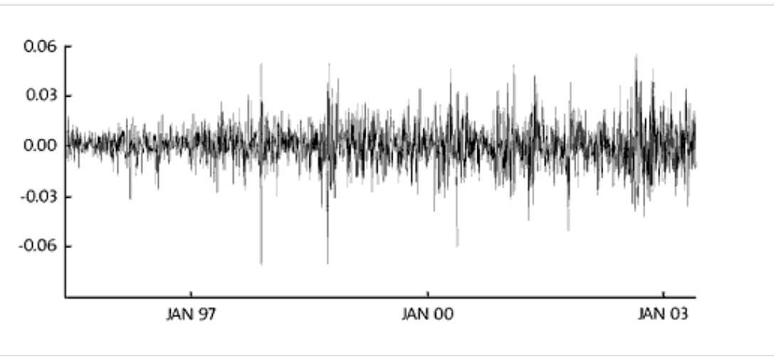 Hình 2 trình bày lợi suất của một khoản đầu tư vào chỉ số chứng khoán NYSE (Standard & Poor’s 500) trong tất cả các ngày giao dịch từ tháng 5 năm 1995 đến tháng 4 năm 2003. Lợi suất trung bình đạt 5,3% mỗi năm. Tuy nhiên, cũng có những ngày mà biến động giá (tăng hoặc giảm) vượt quá 5%. Độ lệch chuẩn của lợi suất ngày, tính trên toàn bộ giai đoạn, là 1,2%. Tuy vậy, khi quan sát kỹ hơn, có thể thấy rằng độ biến động không cố định theo thời gian: những thay đổi lớn (tăng hoặc giảm) thường được theo sau bởi những biến động lớn tiếp theo, trong khi những thay đổi nhỏ lại có xu hướng được theo sau bởi các dao động nhỏ.