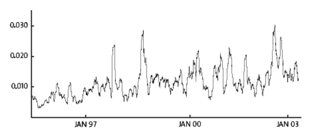 Hiện tượng này được minh họa rõ ràng trong Hình 3, cho thấy độ lệch chuẩn (được tính trên bốn tuần gần nhất) thay đổi theo thời gian. Rõ ràng, độ lệch chuẩn biến thiên đáng kể, từ khoảng 0,5% trong những giai đoạn yên ả đến gần 3% trong các giai đoạn biến động mạnh hơn. Nhiều chuỗi thời gian tài chính khác cũng thể hiện đặc điểm tương tự về độ biến động thay đổi theo thời gian.