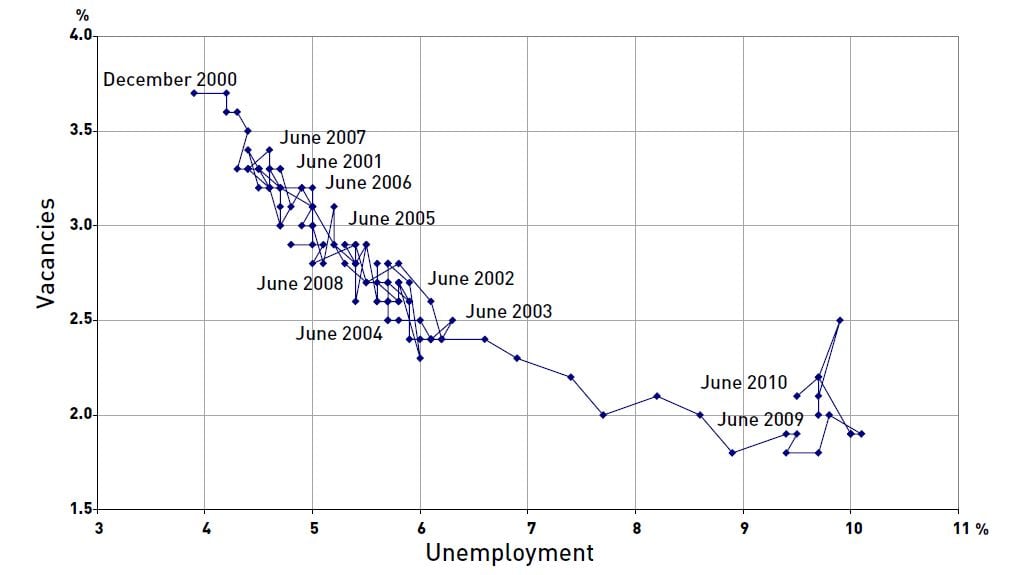 Một nguyên nhân có thể là hiệu quả ghép cặp suy giảm, tức là thời gian thất nghiệp kéo dài hơn trong cùng một bối cảnh thị trường. Một cách lý giải khác là những thay đổi cơ cấu diễn ra nhanh hơn, làm gia tăng tỷ lệ doanh nghiệp sa thải lao động. Những diễn biến như vậy trên thị trường lao động có thể là dấu hiệu cho thấy thất nghiệp dài hạn sẽ gia tăng. Mô hình DMP đã biến đường Beveridge thành một công cụ chẩn đoán được sử dụng rộng rãi trong các phân tích thực nghiệm về thị trường lao động.