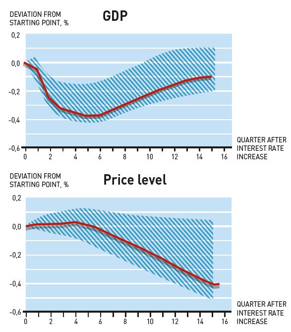 Các hình minh họa bên dưới cho thấy cách một xung lực — dưới dạng tăng lãi suất do ngân hàng trung ương ấn định — dẫn đến những phản ứng khác nhau của các biến kinh tế vĩ mô theo thời gian. Các đồ thị này được xây dựng dựa trên phân tích VAR đối với dữ liệu Hoa Kỳ giai đoạn sau Chiến tranh Thế giới thứ hai (Christiano, Eichenbaum và Evans, 1999), trong đó các cú sốc được nhận diện bằng phương pháp do Sims đề xuất.