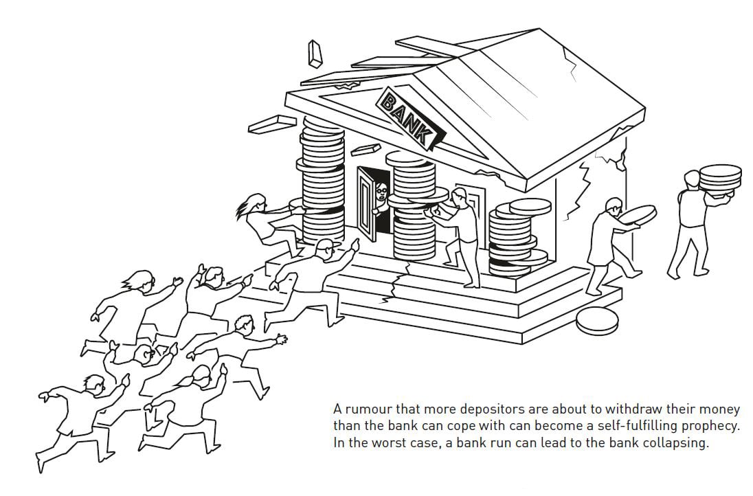 Một tin đồn có thể xuất hiện, nói rằng sẽ có nhiều người gửi tiền đến rút tiền hơn mức ngân hàng có thể đáp ứng. Dù tin đồn này đúng hay sai, nó cũng có thể khiến những người gửi tiền ồ ạt kéo đến ngân hàng để rút tiền, phòng khi ngân hàng phá sản. Khi điều này xảy ra, hiện tượng rút tiền ồ ạt (bank run) sẽ diễn ra.