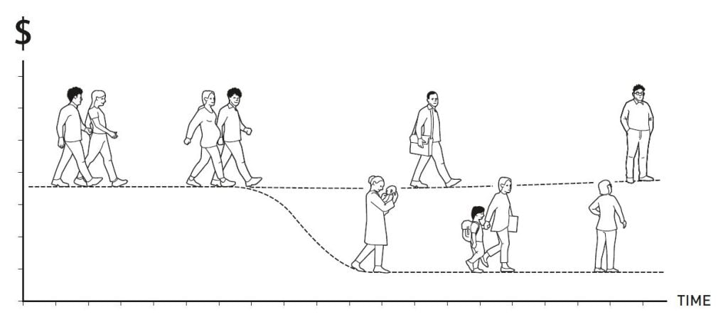 Tuy nhiên, ngay khi người phụ nữ sinh đứa con đầu tiên, xu hướng này thay đổi rõ rệt: thu nhập của họ giảm xuống và không tăng trở lại với tốc độ tương tự như của nam giới, ngay cả khi họ có cùng trình độ học vấn và nghề nghiệp.