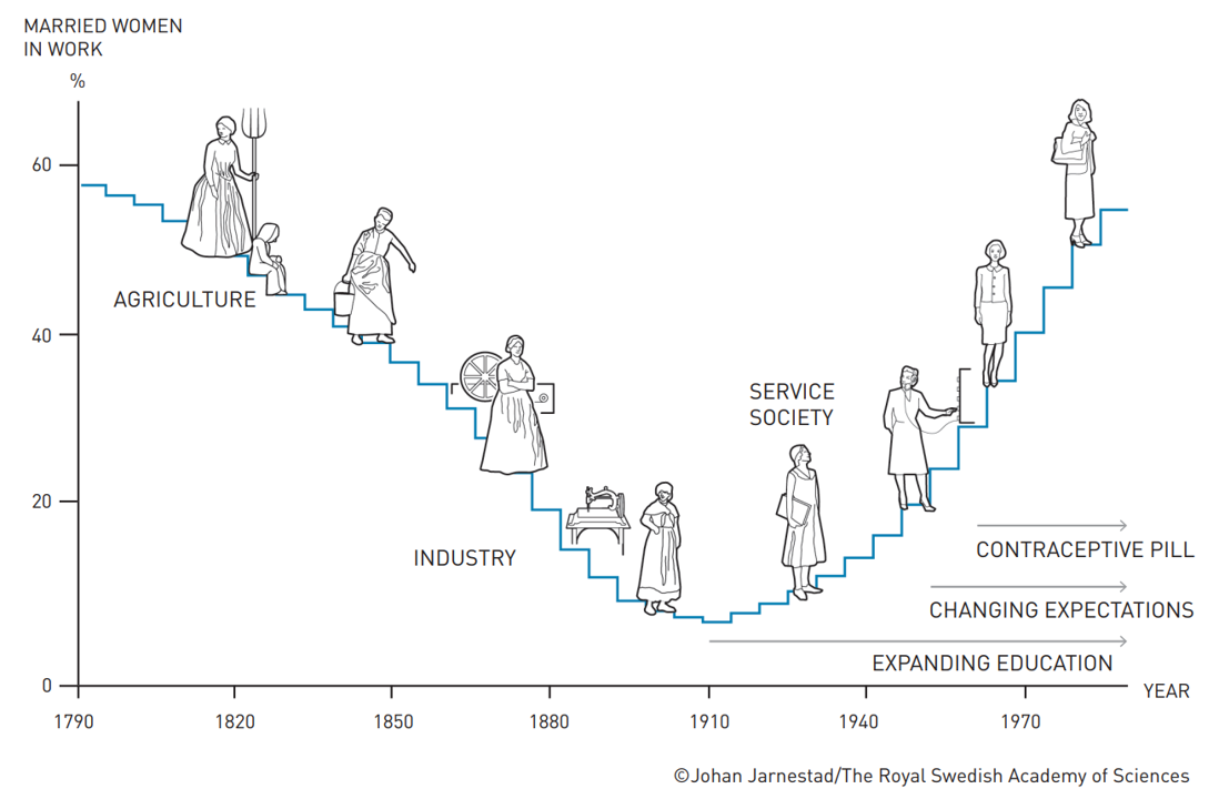 Trong vài thế kỷ qua, xã hội đã trải qua những biến đổi to lớn về chính trị, xã hội và công nghệ. Các quốc gia công nghiệp hóa hiện nay đã duy trì tốc độ tăng trưởng kinh tế ổn định kể từ cuộc Cách mạng Công nghiệp. Sẽ rất dễ để cho rằng tỷ lệ phụ nữ tham gia lực lượng lao động cũng tăng đều theo xu hướng đó, nhưng nghiên cứu của Claudia Goldin cho thấy điều này không đúng.